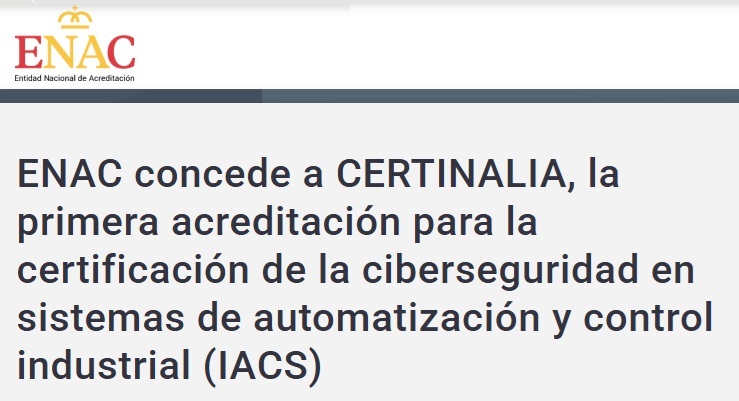 The Spanish National Accreditation Body (ENAC) has accredited CERTINALIA as the first entity in Spain to certify cybersecurity in industrial automation and control systems (IACS) under the UNE-EN IEC 62443 series.