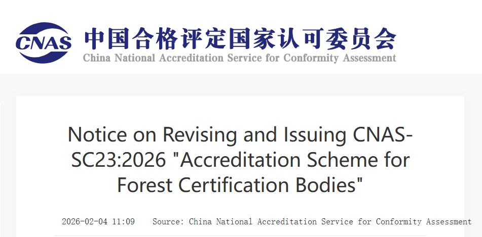The China National Accreditation Service for Conformity Assessment has issued a revised forest certification body accreditation scheme, formally replacing the 2022 edition with CNAS-SC23:2026.