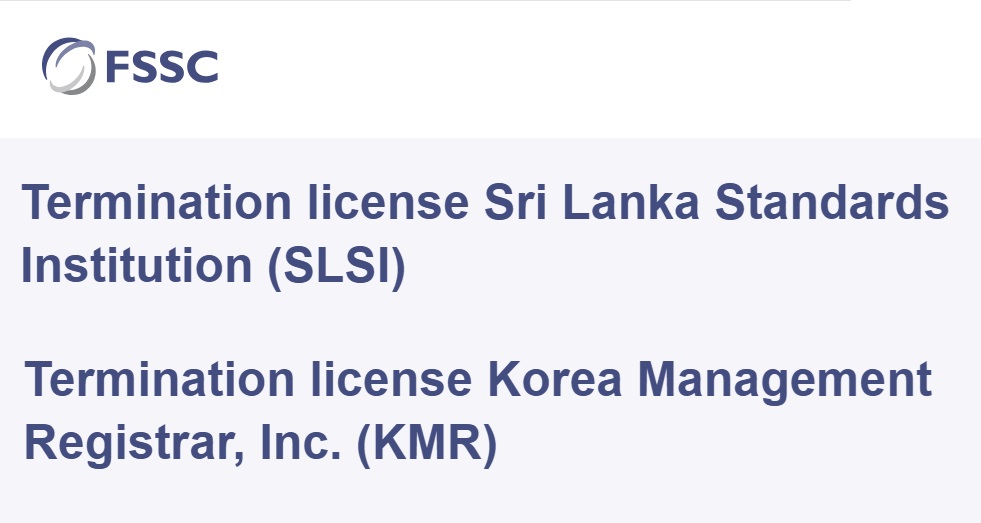 The Foundation FSSC has terminated FSSC 22000 license agreements with the Sri Lanka Standards Institution (SLSI) and Korea Management Registrar, Inc., (KMR) under its sanction policy.