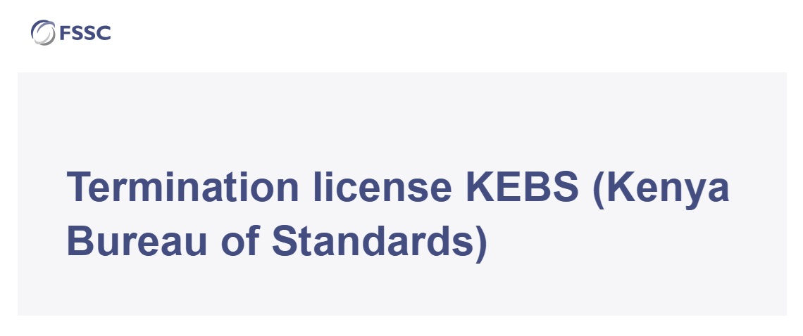 The Foundation FSSC has terminated the FSSC 22000 license agreement of the Kenya Bureau of Standards (KEBS), effective January 12, 2026, under its sanction rules.