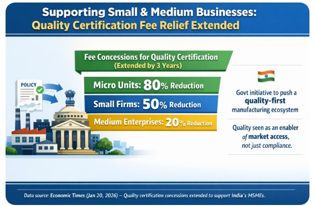 India’s government will extend fee concessions for quality certification by three years to support small and medium enterprises and strengthen its manufacturing base.