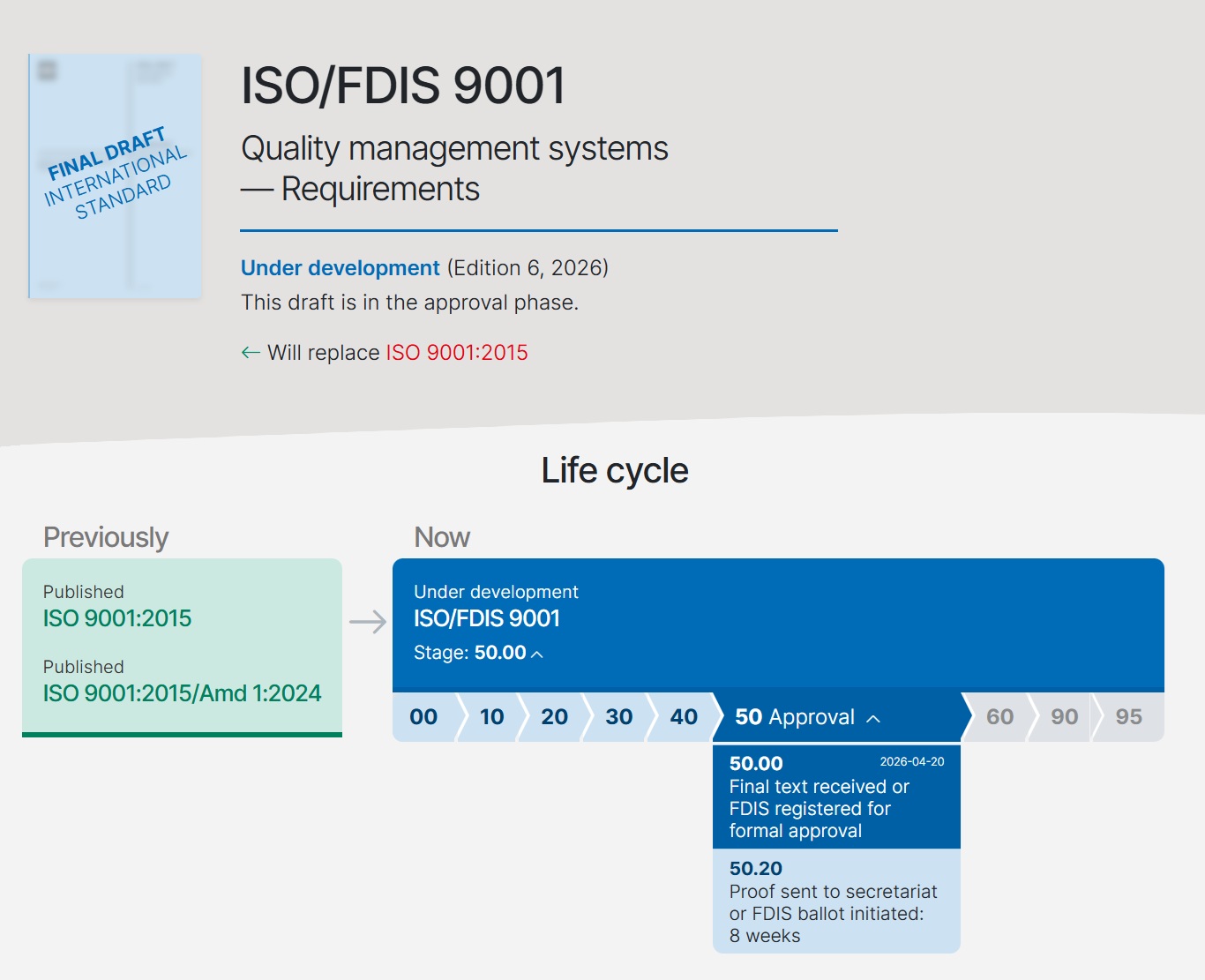 The International Organization for Standardization (ISO) has confirmed that the revision of ISO 9001 has entered the Final Draft International Standard (FDIS) stage, marking the last step before publication.