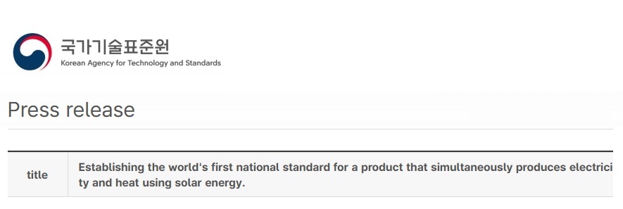 Korea’s Agency for Technology and Standards (KATS) has issued the world’s first standard for a solar product that generates both electricity and heat.