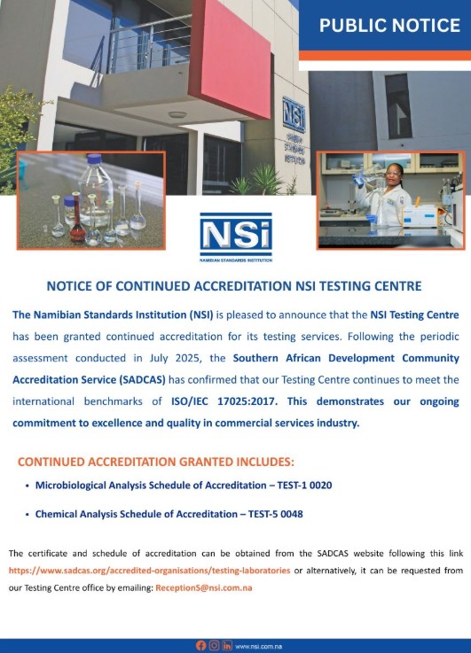 The Namibian Standards Institution (NSI) has confirmed that its Testing Centre has retained accreditation for its laboratory services following a recent assessment, reaffirming compliance with ISO/IEC 17025:2017.