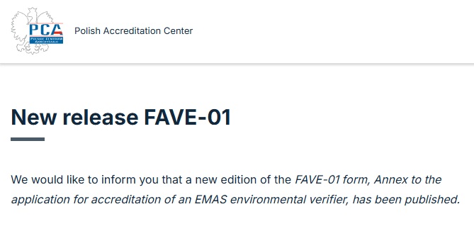 The Polish Centre for Accreditation (PCA) has issued Edition 5 of its FAVE-01 form for organizations seeking accreditation as environmental verifiers under the EU’s Eco-Management and Audit Scheme (EMAS).