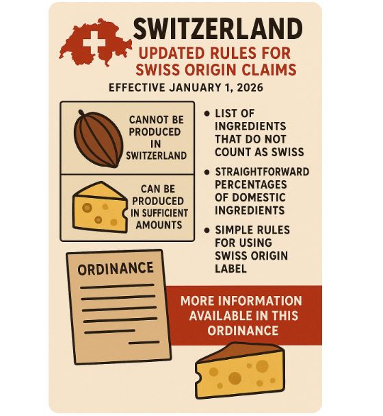 Switzerland has revised its rules on how food can claim a Swiss origin, publishing the updated ordinance with changes that take effect on January 1, 2026.