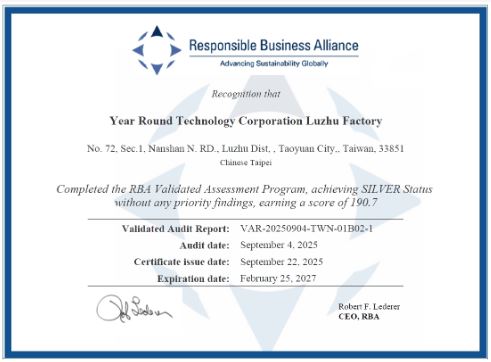 The Taiwanese precision metal manufacturer Year Round Technology Corporation has been recognized with Silver status under the Responsible Business Alliance (RBA) Validated Assessment Program.